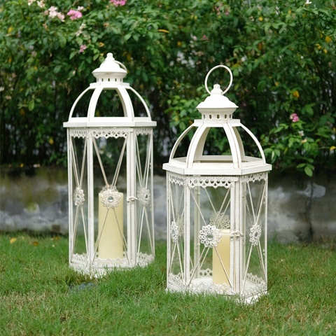 Farolillos de Metal y vidrio para exteriores, FAROL DE Metal decorativo para jardín e interior, farol de Metal decorativo blanco para casa de vacaciones